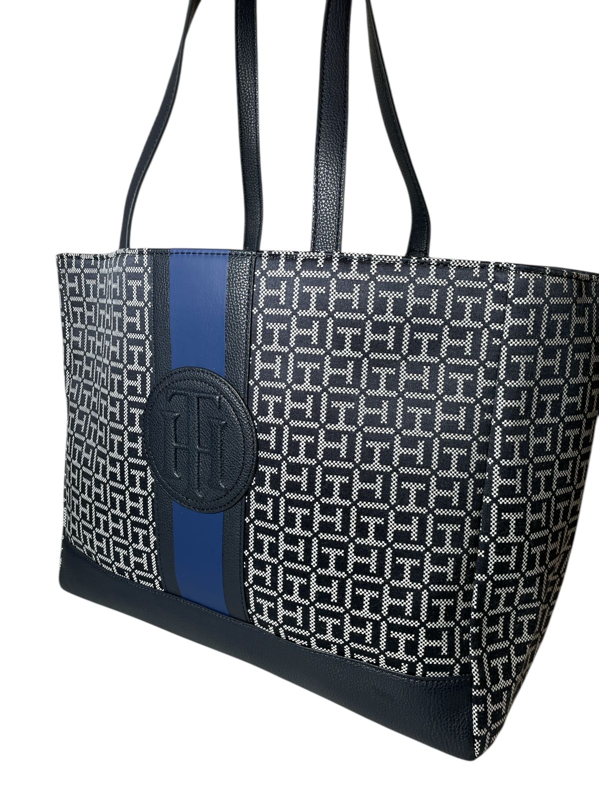 Esta pieza nace como parte de una línea inspirada en la mujer contemporánea que lleva todo consigo: responsabilidades, sueños y estilo. El color azul marino representa confianza, estabilidad y poder. El monograma TH repite un legado que ha conquistado el mundo.